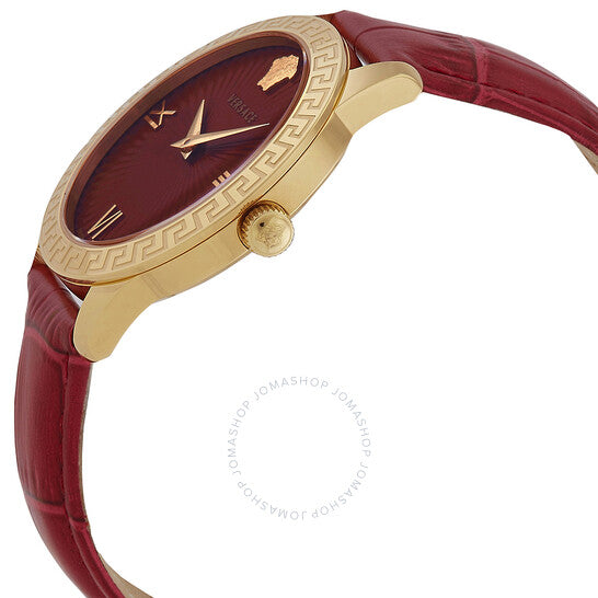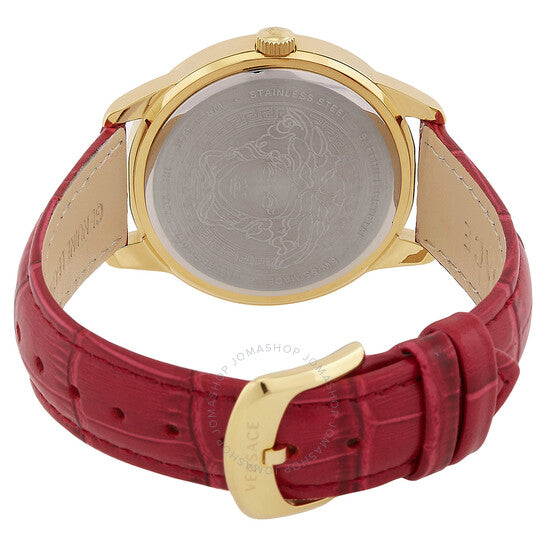 علبة من الفولاذ المقاوم للصدأ بلون ذهبي مع سوار جلدي أحمر. إطار ثابت من الفولاذ المقاوم للصدأ بلون ذهبي. ميناء أحمر بعقارب ذهبية اللون وعلامات ساعات بأرقام رومانية. رأس ميدوسا ثلاثي الأبعاد عند موضع الساعة ١٢. نوع الميناء: تناظري. حركة كوارتز. زجاج ياقوت مقاوم للخدش. تاج قابل للسحب/الدفع. غطاء خلفي صلب. شكل دائري، مقاس العلبة: ٣٨ مم. عرض السوار: ١٦ مم. مشبك بإبزيم. مقاومة للماء حتى عمق ٥٠ مترًا / ١٦٥ قدمًا. الوظائف: الساعات، الدقائق. سلسلة Greca Signature. طراز الساعة الرياضية. علامة الساعة: صناعة سويسرية. ساعة Versace Greca Signature كوارتز نسائية بمينا أحمر VEVC00921.