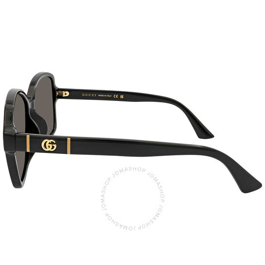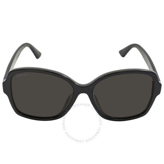 نظارات شمسية من غوتشي. رقم السلسلة: GG0765SA. رمز اللون: 002. الشكل: مربع. عرض العدسة: 57 مم. جسر العدسة: 16 مم. طول الذراع: 145 مم. حماية 100% من الأشعة فوق البنفسجية. غير مستقطبة. مادة الإطار: بلاستيك. لون الإطار: أسود. نوع العدسات: رمادي. نمط الحافة: حافة كاملة. رمز UPC/EAN: 889652296135. نظارات شمسية غوتشي رمادية مربعة نسائية GG0765SA 002 57.