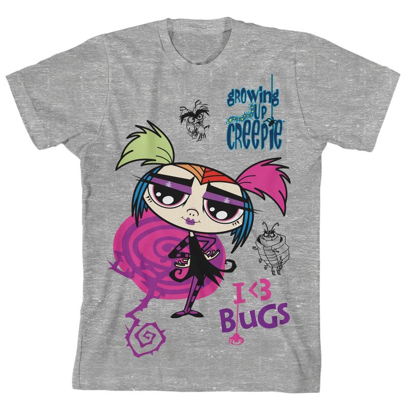 - تصميم مُخصّص: رُسمت شخصية كريبي فوق حروف وردية وأرجوانية كُتب عليها "أنا <3 حشرات" على هذا التيشيرت الجرافيكي، بينما تُحيط الحشرات بالشخصية. حروف زرقاء تُهجّى عنوان السلسلة. سيُعجب مُحبو كريبي الصاعدون بهذا التصميم المُخصّص المُمتع.