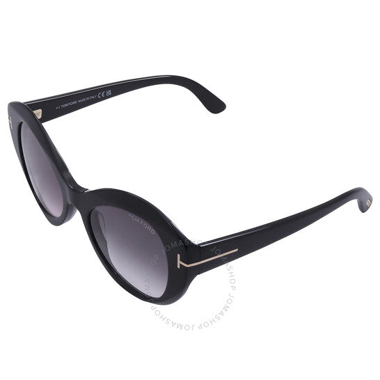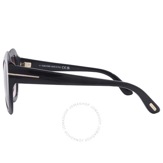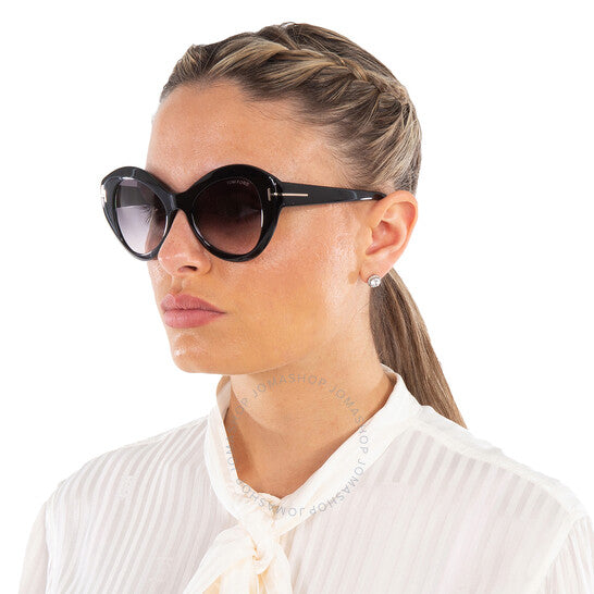 نظارات شمسية من توم فورد. سلسلة جينيفير. رقم السلسلة: FT1084. رمز اللون: 01B. الشكل: فراشة. عرض العدسة: 52 مم. جسر العدسة: 20 مم. طول الذراع: 140 مم. حماية 100% من الأشعة فوق البنفسجية. غير مستقطب. مادة الإطار: بلاستيك. لون الإطار: أسود لامع. نوع العدسات: دخاني متدرج. نمط الحافة: حافة كاملة. رمز UPC/EAN: 889214469298. نظارات شمسية نسائية من توم فورد جينيفير، دخاني متدرج، بتصميم فراشة، FT1084 01B 52.