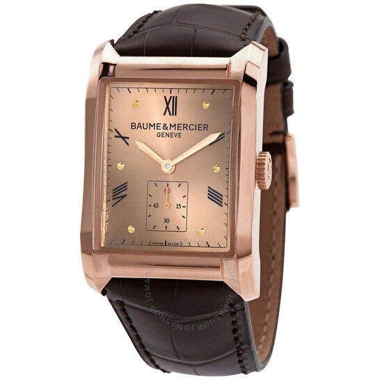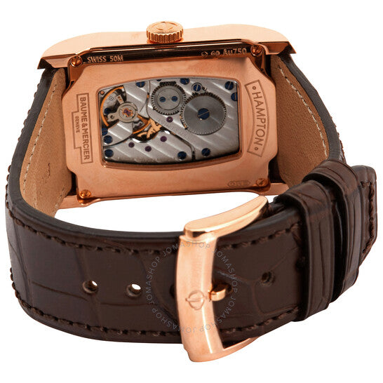 علبة من الذهب الوردي عيار ١٨ قيراطًا مع سوار من جلد التمساح البني. إطار ثابت من الذهب الوردي عيار ١٨ قيراطًا. ميناء نحاسي بعقارب بلون الذهب الوردي، وعلامات ساعات متناوبة بأرقام رومانية ونقاط. علامات دقائق حول الحافة الخارجية. نوع الميناء: تناظري. ميناء فرعي واحد يعرض: ثانية صغيرة. آلية حركة لا جو بيريه ٧٣٦-٣ يدوية التعبئة مع احتياطي طاقة ٤٢ ساعة. زجاج من الياقوت المقاوم للخدش. تاج قابل للسحب/الدفع. غطاء خلفي شفاف. شكل العلبة مستطيل، مقاسها: ٤٧ مم × ٣٥ مم. طول السوار: ٩ بوصات. مشبك تانغ. مقاومة للماء حتى عمق ٥٠ مترًا / ١٦٥ قدمًا. الوظائف: الساعات، الدقائق، الثواني. سلسلة هامبتون ميليه. طراز ساعة رسمية. علامة الساعة: صناعة سويسرية. اختلافات المنتج: MOA10033، M0A10033، 10033. ساعة بوم إي ميرسييه هامبتون ميليس للرجال ذات التعبئة اليدوية 10033.