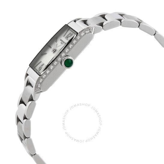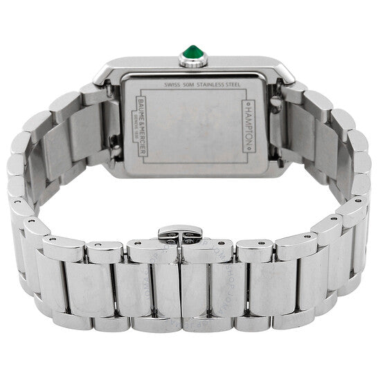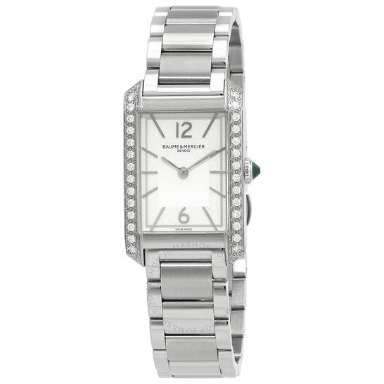 علبة من الفولاذ المقاوم للصدأ مع سوار من الفولاذ المقاوم للصدأ. إطار ثابت من الفولاذ المقاوم للصدأ مرصع بالألماس. ميناء فضي بعقارب فضية اللون وعلامات ساعات. أرقام عربية عند موضعي الساعة 6 و12. نوع الميناء: تناظري. حركة كوارتز. زجاج ياقوت مقاوم للخدش. تاج قابل للسحب/الدفع. غطاء خلفي صلب. شكل العلبة مستطيل. أبعاد العلبة: 35 مم × 22 مم. سُمك العلبة: 7 مم. مشبك قابل للطي بزر ضغط مزدوج. مقاومة للماء حتى عمق 50 مترًا / 165 قدمًا. الوظائف: الساعات، الدقائق. سلسلة هامبتون. طراز ساعة رسمية. علامة الساعة: صناعة سويسرية. ساعة بوم إيه ميرسييه هامبتون كوارتز نسائية بمينا فضية مرصعة بالألماس، رقم 10631.