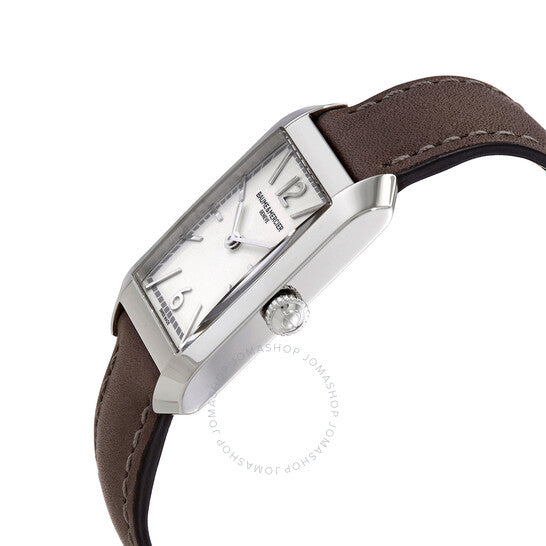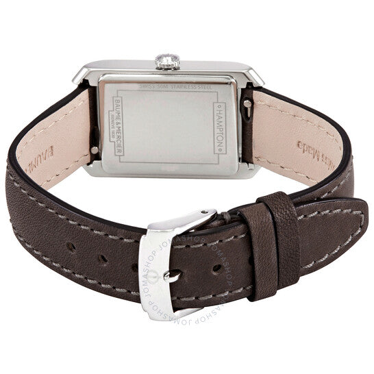 علبة من الفولاذ المقاوم للصدأ مع سوار من جلد العجل البني الداكن. إطار ثابت من الفولاذ المقاوم للصدأ. ميناء فضي اللون مع عقارب ومؤشرات ساعات مطلية بالروديوم فضية اللون. أرقام عربية عند موضعي الساعة 6 و12. مؤشرات دقائق حول الحافة الخارجية. نوع الميناء: تناظري. غير مضيء. حركة كوارتز من بوم إيه ميرسييه، عيار MHH057. زجاج ياقوت مقاوم للخدش. تاج قابل للسحب/الدفع. غطاء خلفي صلب. شكل مستطيل. أبعاد العلبة: 35 مم × 22 مم. سمكها: 6.92 مم. مشبك تانغ. مقاومة للماء حتى عمق 50 مترًا / 165 قدمًا. الوظائف: ساعة، دقيقة. سلسلة هامبتون. طراز ساعة رسمية. علامة الساعة: صناعة سويسرية. ساعة بوم إيه ميرسييه هامبتون كوارتز نسائية بمينا فضي، 10471.