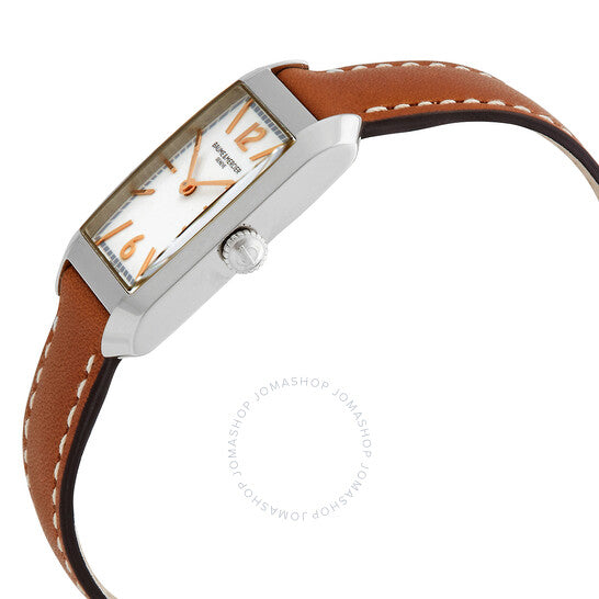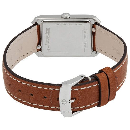 علبة من الفولاذ المقاوم للصدأ مع سوار من جلد العجل بلون بني فاتح. إطار ثابت من الفولاذ المقاوم للصدأ. ميناء فضي اللون مع عقارب مطلية بالروديوم بلون الذهب الوردي وعلامات ساعات. تظهر أرقام عربية عند موضعي الساعة 6 و12. علامات دقائق حول الحافة الخارجية. نوع الميناء: تناظري. غير مضيء. حركة كوارتز من بوم إيه ميرسييه، عيار MHH057. زجاج ياقوت مقاوم للخدش. تاج قابل للسحب/الدفع. غطاء خلفي صلب. شكل مستطيل. أبعاد العلبة: 35 مم × 22 مم. سمكها: 6.92 مم. مشبك تانغ. مقاومة للماء حتى عمق 50 مترًا / 165 قدمًا. الوظائف: ساعة، دقيقة. سلسلة هامبتون. طراز ساعة رسمية. علامة الساعة: صناعة سويسرية. ساعة بوم إيه ميرسييه هامبتون كوارتز نسائية بمينا فضي، رقم 10472.