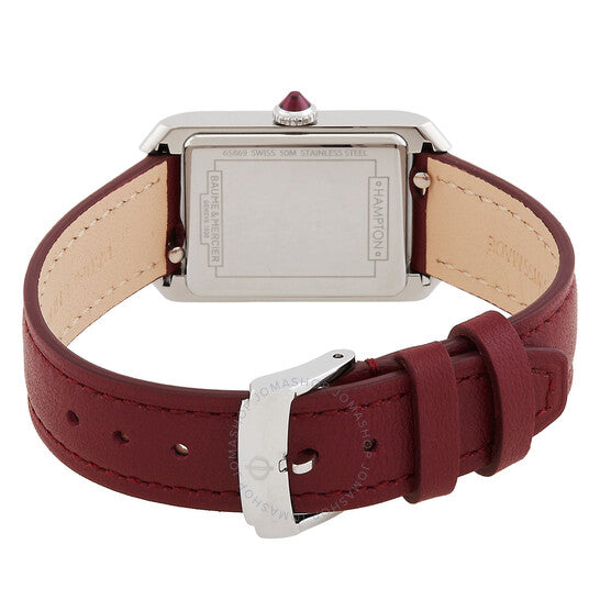 علبة من الفولاذ المقاوم للصدأ فضية اللون مع سوار جلدي أحمر. إطار ثابت من الفولاذ المقاوم للصدأ فضي اللون. ميناء أحمر بعقارب فضية اللون. نوع الميناء: تناظري. حركة كوارتز. زجاج ياقوت مقاوم للخدش. تاج قابل للسحب/الدفع. غطاء خلفي صلب. شكل العلبة مستطيل، مقاسها: 35 مم، سمكها: 7 مم. مشبك بإبزيم. مقاومة للماء حتى عمق 50 مترًا / 165 قدمًا. الوظائف: الساعات، الدقائق. سلسلة هامبتون. طراز ساعة رسمية. علامة الساعة: جنيف 1830. بوم إيه ميرسييه هامبتون، ساعة نسائية بمينا أحمر، طراز M0A10673.