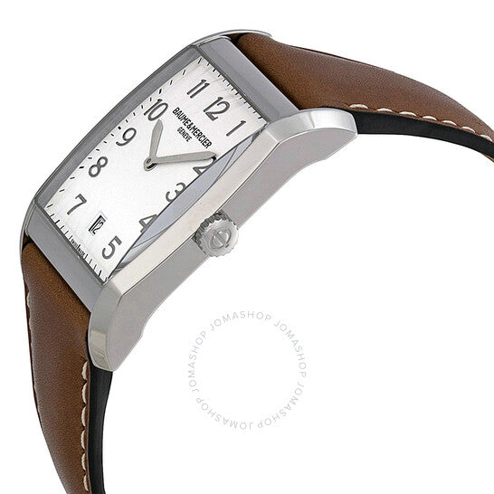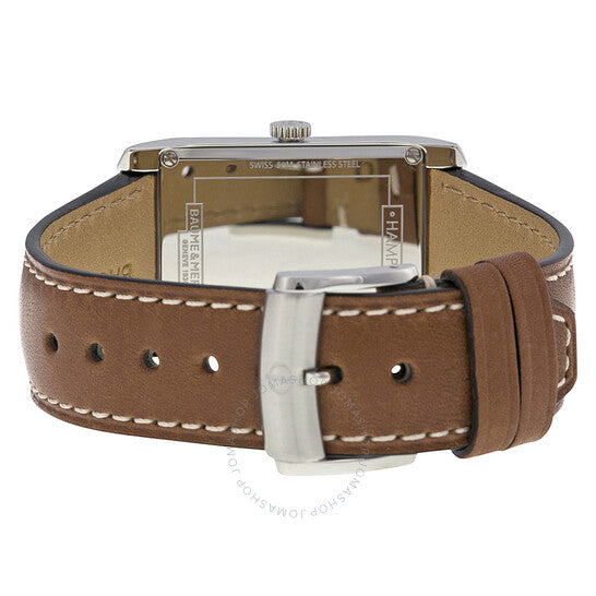 علبة من الفولاذ المقاوم للصدأ مع سوار من جلد العجل البني. إطار ثابت من الفولاذ المقاوم للصدأ. ميناء أبيض بعقارب فضية اللون على شكل سيف وعلامات ساعات بأرقام عربية. علامات دقائق حول الحافة الخارجية. نوع الميناء: تناظري. عرض التاريخ عند موضع الساعة السادسة. حركة كوارتز روندا عيار 704. زجاج معدني مقاوم للخدش. تاج قابل للسحب/الدفع. غطاء خلفي صلب. شكل مستطيل. أبعاد العلبة: 42.3 مم × 29.2 مم. سمك العلبة: 8.1 مم. مشبك تانغ. مقاومة للماء حتى عمق 50 مترًا / 165 قدمًا. الوظائف: التاريخ، الساعة، الدقائق. تصميم ساعة كاجوال. علامة الساعة: صناعة سويسرية. إصدارات المنتج: MOA10153، M0A10153، 10153. ساعة بوم إيه ميرسييه هامبتون للرجال بمينا أبيض وجلد بني، 10153.