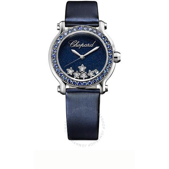 علبة من الفولاذ المقاوم للصدأ مع سوار حريري أزرق. إطار ثابت مرصع بألماس أزرق. ميناء أزرق بعقارب فضية اللون. يظهر عرض التاريخ بين الساعة الرابعة والخامسة. آلية حركة كوارتز. زجاج ياقوتي مقاوم للخدش. قطر العلبة: ٣٦ مم. مشبك تانغ. مقاومة للماء حتى عمق ٣٠ مترًا/١٠٠ قدم. الوظائف: الساعات، الدقائق، الثواني. ساعة شوبارد هابي أنيفيرسر النسائية رقم ٢٧٨٤٧٦-٢٠١١.