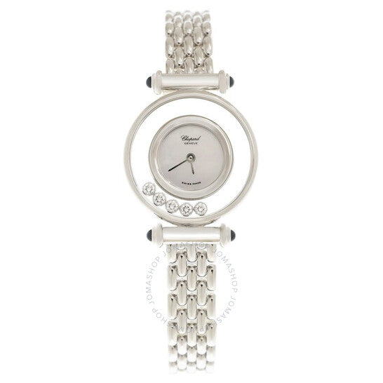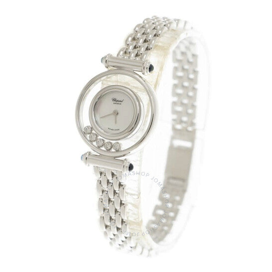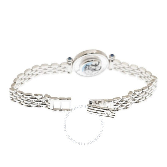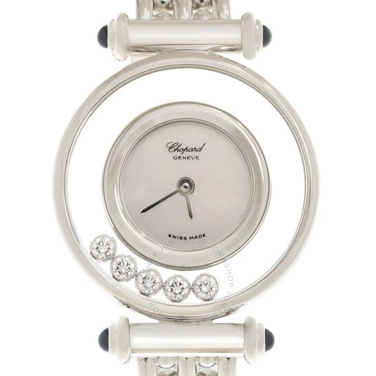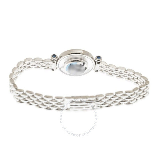 علبة من الذهب الأبيض عيار ١٨ قيراطًا مع سوار من الذهب الأبيض عيار ١٨ قيراطًا. إطار ثابت مزدوج من الذهب الأبيض عيار ١٨ قيراطًا مرصع بخمس ماسات متدحرجة. ميناء فضي بعقارب فضية اللون. بدون مؤشرات. نوع الميناء: تناظري. حركة كوارتز. زجاج ياقوت مقاوم للخدش. غطاء خلفي شفاف. شكل دائري، مقاس العلبة: ٢٥ مم. مشبك قابل للطي. الوظائف: الساعات والدقائق. معلومات إضافية: العلبة الأصلية، دليل الاستخدام (ملحقات كاملة). سلسلة هابي دايموندز. تصميم ساعة فاخرة. علامة الساعة: صناعة سويسرية. ساعة شوبارد هابي دايموندز كوارتز نسائية بمينا فضي، رقمها ٢٠٤٧٨٠ ١٠١٨.