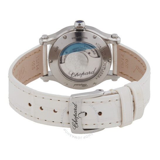 علبة من الفولاذ المقاوم للصدأ فضية اللون مع سوار من جلد التمساح الأبيض. إطار ثابت من الفولاذ المقاوم للصدأ فضي اللون. ميناء فضي/عائم/مرصع بالألماس مع عقارب فضية اللون وعلامات ساعات بأرقام رومانية. نوع الميناء: تناظري. حركة أوتوماتيكية من شوبارد عيار 09.01-C، تحتوي على 27 جوهرة، تنبض بمعدل 25200 ذبذبة في الساعة، ولديها احتياطي طاقة لمدة 42 ساعة تقريبًا. زجاج ياقوت مقاوم للخدش. غطاء خلفي شفاف. شكل العلبة دائري، مقاسها 30 مم. مشبك تانغ. مقاومة للماء حتى عمق 30 مترًا / 100 قدم. الوظائف: الساعات، الدقائق، الثواني، الكرونومتر. معلومات إضافية: العلبة الأصلية، بطاقة الضمان الدولية، دليل الاستخدام (ملحقات كاملة). سلسلة هابي سنوفليكس. تصميم ساعة فاخرة. ملصق الساعة: صناعة سويسرية. ساعة شوبارد هابي سنوفليكس أوتوماتيكية كرونومتر نسائية 278573-3022.