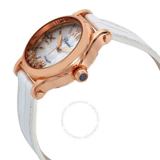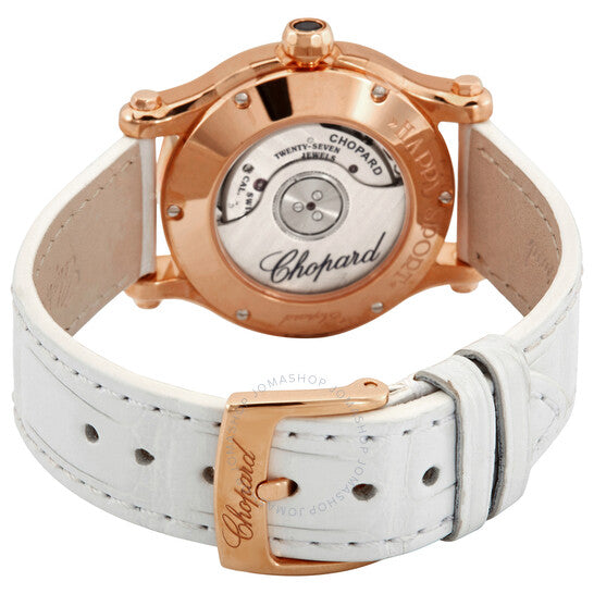 علبة من الذهب الوردي عيار ١٨ قيراطًا مع سوار من جلد التمساح الأبيض. إطار ثابت من الذهب الوردي عيار ١٨ قيراطًا مرصع بالألماس. ميناء من عرق اللؤلؤ (بخمس ماسات عائمة) مع عقارب ومؤشرات ساعات من الذهب الوردي. أرقام رومانية تُشير إلى مواضع الساعة ٣، ٦، ٩، و١٢. علامات دقائق حول الحافة الخارجية. نوع الميناء: تناظري. حركة أوتوماتيكية من عيار Sellita SW 300-1، مستوحاة من Sellita SW 300، تحتوي على ٢٥ جوهرة، تنبض بمعدل ٢٨٨٠٠ ذبذبة في الساعة، ولديها احتياطي طاقة لمدة ٣٨ ساعة تقريبًا. زجاج من الياقوت المقاوم للخدش. تاج قابل للسحب/الدفع. غطاء خلفي شفاف. شكل دائري. حجم العلبة: ٣٠ مم. سمك العلبة: ١٢.٢ مم. عرض السوار: ٢٠ مم. طول السوار: ٧ بوصات. مشبك تانغ. مقاومة للماء حتى عمق ٣٠ مترًا / ١٠٠ قدم. الوظائف: الساعات، الدقائق، الثواني. سلسلة هابي سبورت. ساعة فاخرة. صناعة سويسرية. ساعة شوبارد هابي سبورت أوتوماتيكية مرصعة بالألماس للسيدات، 274893 5009 WH.