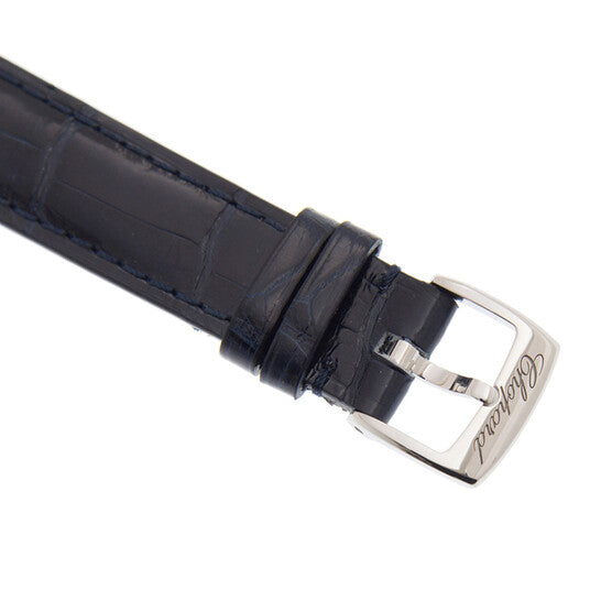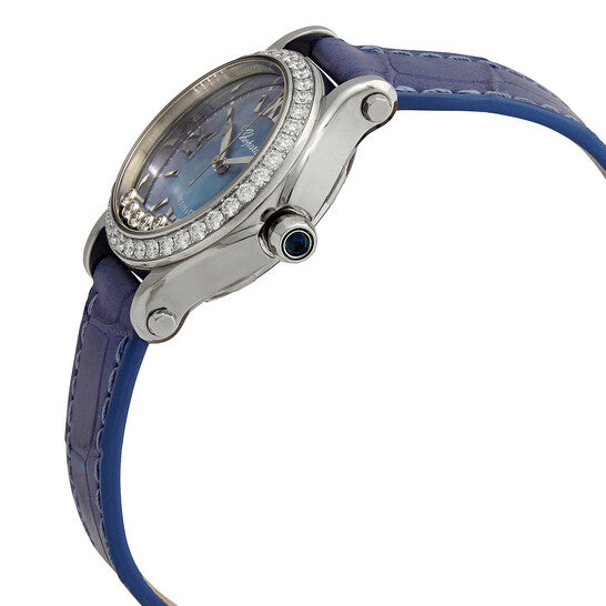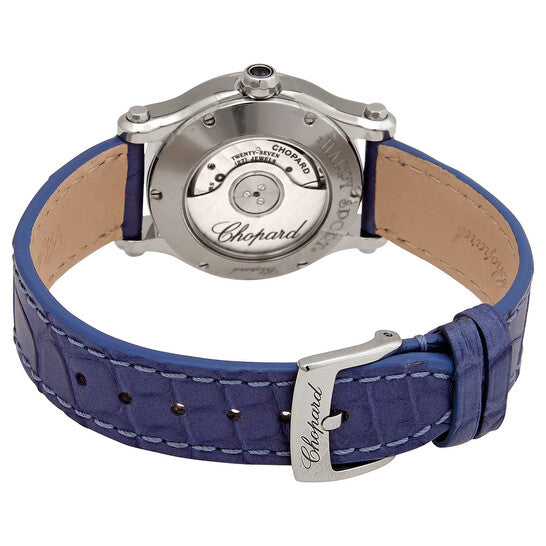 علبة من الفولاذ المقاوم للصدأ مع سوار أزرق من جلد التمساح. إطار ثابت من الفولاذ المقاوم للصدأ مرصع بالألماس. ميناء من عرق اللؤلؤ مع عقارب فضية اللون على شكل سيف وعلامات ساعات. تظهر الأرقام الرومانية عند مواضع الساعة 3 و6 و9 و12. علامات الدقائق حول الحافة الخارجية. نوع الميناء: تناظري. حركة أوتوماتيكية من عيار Sellita SW 300-1، مستوحاة من Sellita SW 300، تحتوي على 25 جوهرة، تنبض بمعدل 28800 ذبذبة في الساعة، ولديها احتياطي طاقة لمدة 38 ساعة تقريبًا. زجاج من الياقوت المقاوم للخدش. تاج لولبي. ظهر هيكلي. شكل دائري. حجم العلبة: 30 مم. مشبك تانغ. مقاومة للماء حتى عمق 30 مترًا / 100 قدم. الوظائف: الساعات، الدقائق، الثواني. معلومات إضافية: خمس ماسات متحركة على الميناء. سلسلة Happy Sport. تصميم ساعة فاخر. علامة الساعة: صناعة سويسرية. ساعة شوبارد هابي سبورت أوتوماتيكية للسيدات 278573-3010.