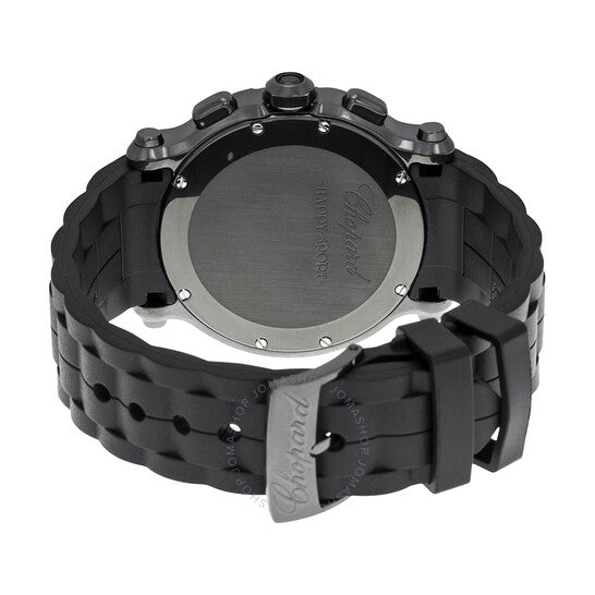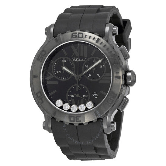 علبة من الفولاذ المقاوم للصدأ مطلية باللون الأسود بتقنية PVD مع سوار مطاطي أسود. إطار دوار أحادي الاتجاه. ميناء أسود مرصع بخمس ماسات عائمة وعقارب مضيئة. مؤشرات ساعات بأرقام رومانية تُشير إلى مواقع الساعات 3 و6 و9 و12. مؤشرات دقائق حول الحافة الخارجية. يظهر عرض التاريخ بين موقعي الساعة 4 و5. ثلاثة أقراص فرعية تعرض: عُشر الثانية، 30 دقيقة، و60 ثانية. آلية حركة كوارتز. كريستال ياقوت مقاوم للخدش. تاج مرصع بياقوت أسود. غطاء خلفي صلب. قطر العلبة: 40.5 مم. سُمكها: 12.8 مم. مشبك تانغ. مقاومة للماء حتى عمق 30 مترًا/100 قدم. الوظائف: الساعات، الدقائق، الثواني، التاريخ، الكرونوغراف. ساعة شوبارد هابي سبورت كرونو النسائية 288499-3007.