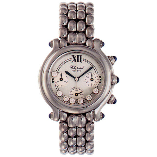 علبة من الفولاذ المقاوم للصدأ مع سوار فضي اللون من الفولاذ المقاوم للصدأ. إطار ثابت من الفولاذ المقاوم للصدأ. ميناء أبيض مرصع بسبع ماسات عائمة، وعقارب زرقاء على شكل سيف وعلامات ساعات بأرقام رومانية زرقاء. علامات دقائق حول الحافة الخارجية. نوع الميناء: تناظري. كرونوغراف - ثلاثة أقراص فرعية تعرض: ٦٠ ثانية، ٦٠ دقيقة، و١٢ ساعة. حركة كوارتز. زجاج ياقوت مقاوم للخدش. شكل العلبة دائري، حجمها: ٣٢ مم، سمكها: ٨.٥ مم. طول السوار: ٧ بوصات. مشبك قابل للطي. مقاومة للماء حتى عمق ٣٠ مترًا / ١٠٠ قدم. الوظائف: الساعات/الدقائق/الثواني/الكرونوغراف. معلومات إضافية: عقارب الساعات، الدقائق، الثواني المركزية. ٧ ماسات عائمة. سلسلة هابي سبورت. تصميم ساعة فاخرة. علامة الساعة: صناعة سويسرية. إصدارات المنتج: ٢٧٨٣٢٤٢٣، ٢٧٨٣٢٤ ٢٣. ساعة شوبارد هابي سبورت كرونوغراف نسائية من الفولاذ، ٢٧٨٣٢٤-٢٣.