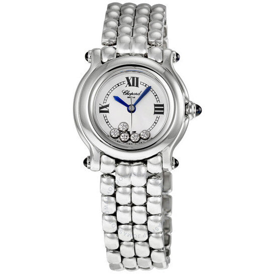 علبة من الفولاذ المقاوم للصدأ مع سوار من الفولاذ المقاوم للصدأ. إطار ثابت من الفولاذ المقاوم للصدأ. ميناء أبيض مرصع بخمس ماسات عائمة وعقارب زرقاء. أرقام رومانية تُشير إلى الساعات 3 و6 و9 و12. علامات دقائق حول حلقة داخلية. نوع الميناء: تناظري. حركة كوارتز. زجاج ياقوت مقاوم للخدش. تاج من الياقوت الأزرق بتصميم كابوشون. غطاء خلفي صلب. حجم العلبة: 26 مم. سُمكها: 8 مم. شكلها دائري. طول السوار: 7 بوصات. مشبك قابل للطي مخفي. مقاومة للماء حتى عمق 30 مترًا / 100 قدم. الوظائف: الساعات، الدقائق، الثواني. طراز ساعة رسمية. علامة الساعة: صناعة سويسرية. إصدارات المنتج: 27/8250-23. ساعة شوبارد هابي سبورت دايموند ستيل نسائية 27/8250-23.