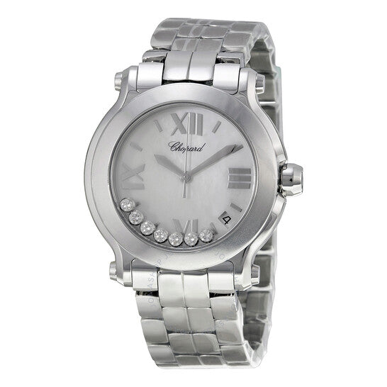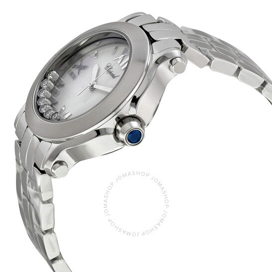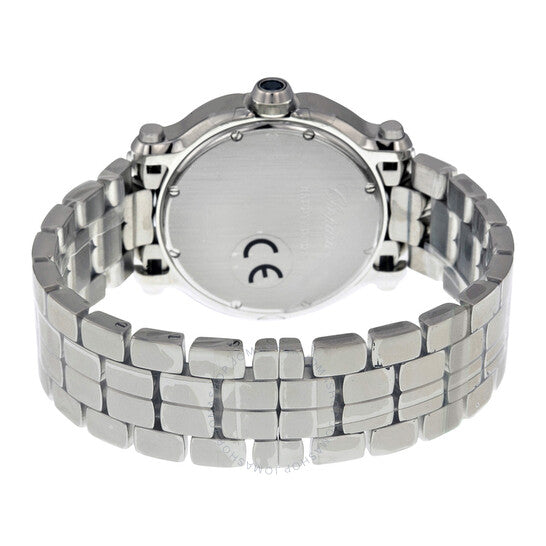 علبة من الفولاذ المقاوم للصدأ مع سوار من الفولاذ المقاوم للصدأ. إطار ثابت من الفولاذ المقاوم للصدأ. ميناء من عرق اللؤلؤ مع 7 ماسات عائمة، وعقارب فضية اللون وعلامات ساعات. أرقام رومانية تُشير إلى مواقع الساعات 3 و6 و9 و12. نوع الميناء: تناظري. يعرض التاريخ بين موقعي الساعة 4 و5. حركة كوارتز. زجاج ياقوت مقاوم للخدش. تاج دفع/سحب مرصع بياقوت أزرق. غطاء خلفي صلب. قطر العلبة: 36 مم. سمكها: 11 مم. شكل العلبة دائري. عرض السوار: 18 مم. طول السوار: 7 بوصات. مشبك قابل للطي مخفي. مقاومة للماء حتى عمق 30 مترًا / 100 قدم. الوظائف: الساعات/الدقائق/الثواني/التاريخ. معلومات إضافية: عقارب الساعات والدقائق والثواني المركزية. 7 ماسات عائمة. تاريخ أوتوماتيكي بين موقعي الساعة 4 و5. طراز ساعة رسمية. علامة الساعة: صناعة سويسرية. ساعة شوبارد هابي سبورت نسائية مرصعة بالألماس 278477-3002.
