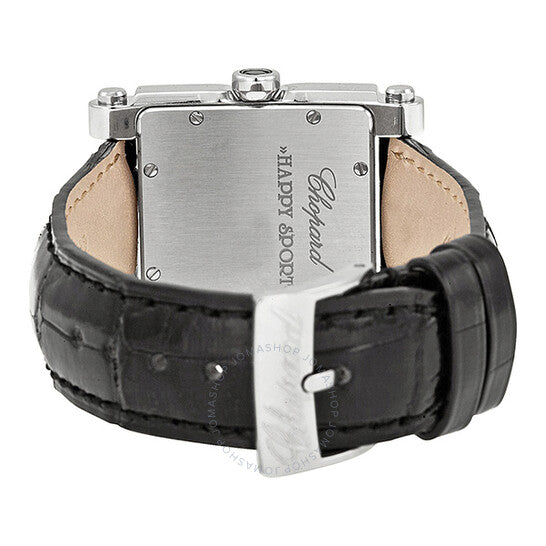 علبة من الفولاذ المقاوم للصدأ مع سوار جلدي أزرق داكن. إطار ثابت من الفولاذ المقاوم للصدأ. ميناء أبيض مرصع بسبع ماسات عائمة وعقارب فضية اللون. أرقام رومانية تُشير إلى مواقع الساعات 3 و6 و9 و12. نوع الميناء: تناظري. عرض التاريخ عند موضع الساعة 4. آلية حركة كوارتز. كريستال ياقوتي مقاوم للخدش. تاج سحب/دفع مرصع بحجر كابوشون من الياقوت. غطاء خلفي صلب. قطر العلبة: 38 مم. سمكها: 10 مم. شكل العلبة مربع. عرض السوار: 16 مم. مشبك قابل للطي. مقاومة للماء حتى عمق 100 متر/330 قدمًا. الوظائف: الساعات، الدقائق، الثواني، التاريخ. تصميم ساعة فاخرة. ساعة شوبارد هابي سبورت النسائية 278495-3001.