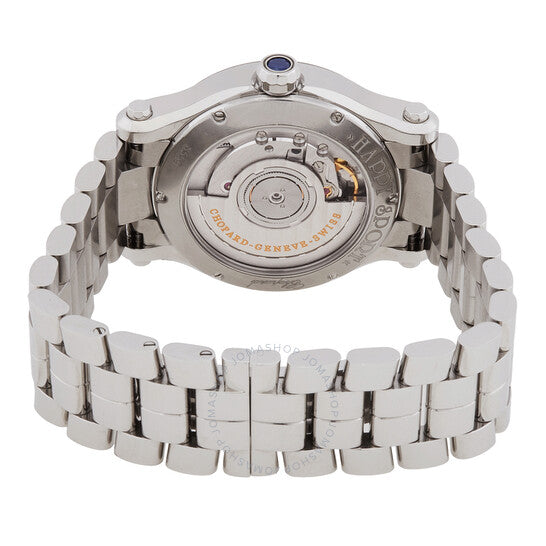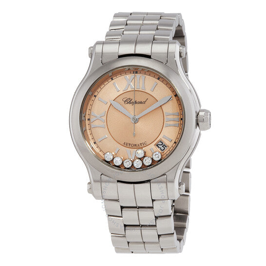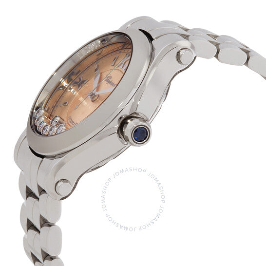 علبة فضية اللون من الفولاذ المقاوم للصدأ مع سوار بني من الفولاذ المقاوم للصدأ. إطار ثابت فضي اللون من الفولاذ المقاوم للصدأ. ميناء وردي بعقارب فضية اللون وعلامات ساعات رومانية. علامات دقائق حول الحافة الخارجية. نوع الميناء: تناظري. عرض التاريخ بين موضعي الساعة 4 و5. حركة أوتوماتيكية مع احتياطي طاقة لمدة 42 ساعة. زجاج ياقوت مقاوم للخدش ومقاوم للانعكاس. تاج قابل للسحب/الدفع. غطاء خلفي شفاف. شكل دائري، مقاس العلبة: 36 مم، سمكها: 12.30 مم. مشبك قابل للطي مخفي. مقاومة للماء حتى عمق 30 مترًا / 100 قدم. الوظائف: التاريخ، الساعة، الدقائق، الثواني. سلسلة هابي سبورت. طراز الساعة الرياضية. علامة الساعة: صناعة سويسرية. ساعة شوبارد هابي سبورت أوتوماتيكية نسائية بمينا وردي، 278559-3025.