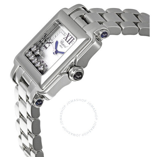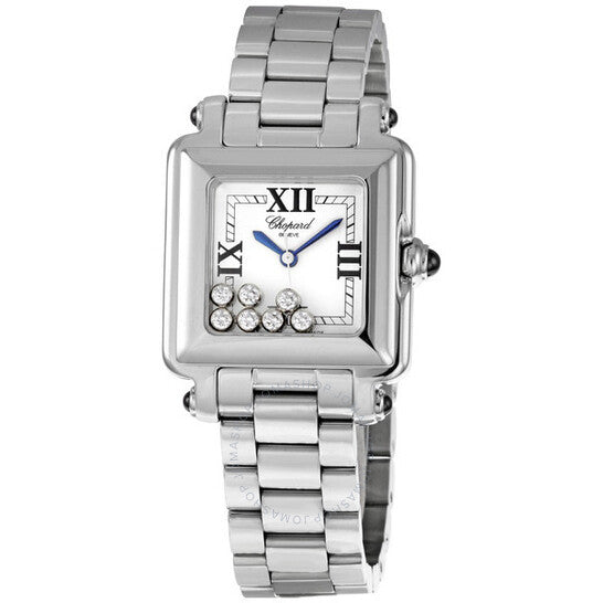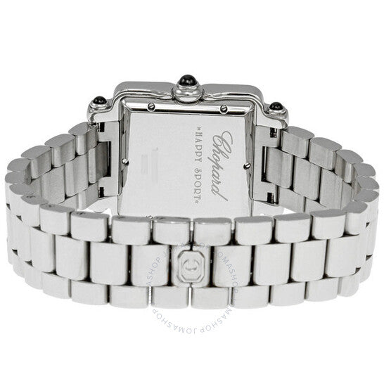 علبة من الفولاذ المقاوم للصدأ مع سوار من الفولاذ المقاوم للصدأ. إطار ثابت من الفولاذ المقاوم للصدأ. ميناء أبيض مرصع بسبع ماسات عائمة، وعقارب فولاذية زرقاء، وأرقام رومانية تُشير إلى الساعات 3 و6 و9 و12. علامات دقائق حول الحافة الخارجية. يعرض التاريخ عند الساعة 6. حركة كوارتز. زجاج من الياقوت المقاوم للخدش. غطاء خلفي صلب. أبعاد العلبة: 26 مم × 26 مم. مشبك قابل للطي. مقاومة للماء حتى عمق 30 مترًا/100 قدم. الوظائف: الساعات، الدقائق، الثواني. ساعة شوبارد هابي سبورت سكوير النسائية 278349-3006WHT.