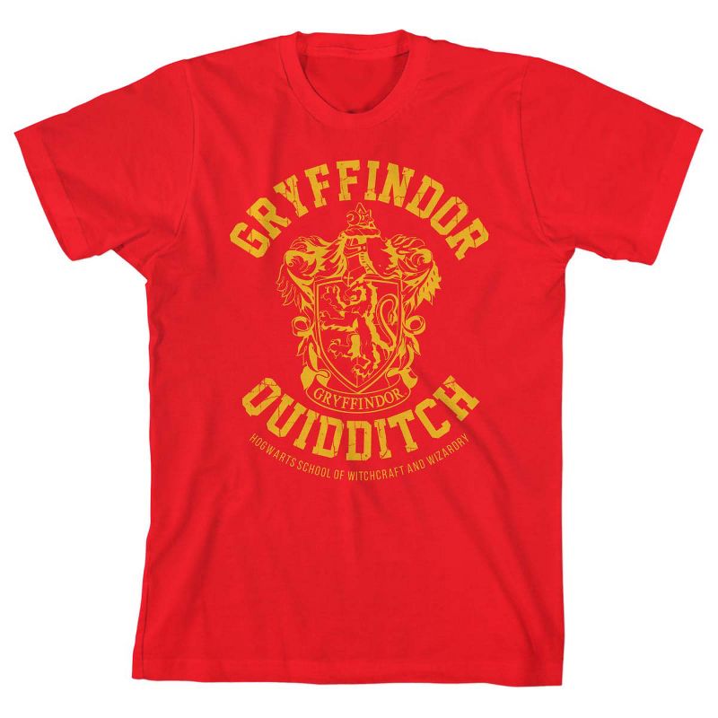 - تيشيرت برسومات جرافيكية: يتميز هذا التيشيرت الصبياني بشعار بيت هوجورتس الشجاع، جريفندور، مرسومًا باللون الذهبي. يحمل الشعار صورة غريفين. فوق الشعار وأسفله، تُكتب عبارة "جريفندور كويدتش" بحروف ذهبية.
