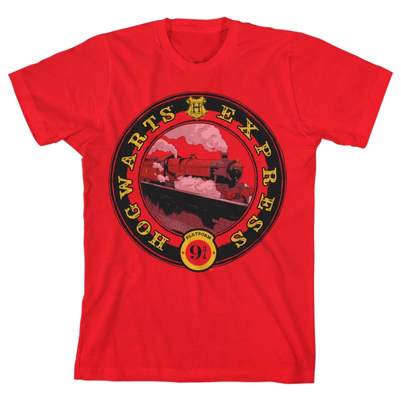 - تيشيرت برسومات جرافيكية: يُظهر هذا التيشيرت قطار هوجورتس السريع الشهير من سلسلة هاري بوتر. يُحيط بالقطار دائرة حمراء وسوداء، مطبوع عليها اسمه بأحرف صفراء. يُشار إلى الرصيف 9 ¾ أسفل الدائرة.