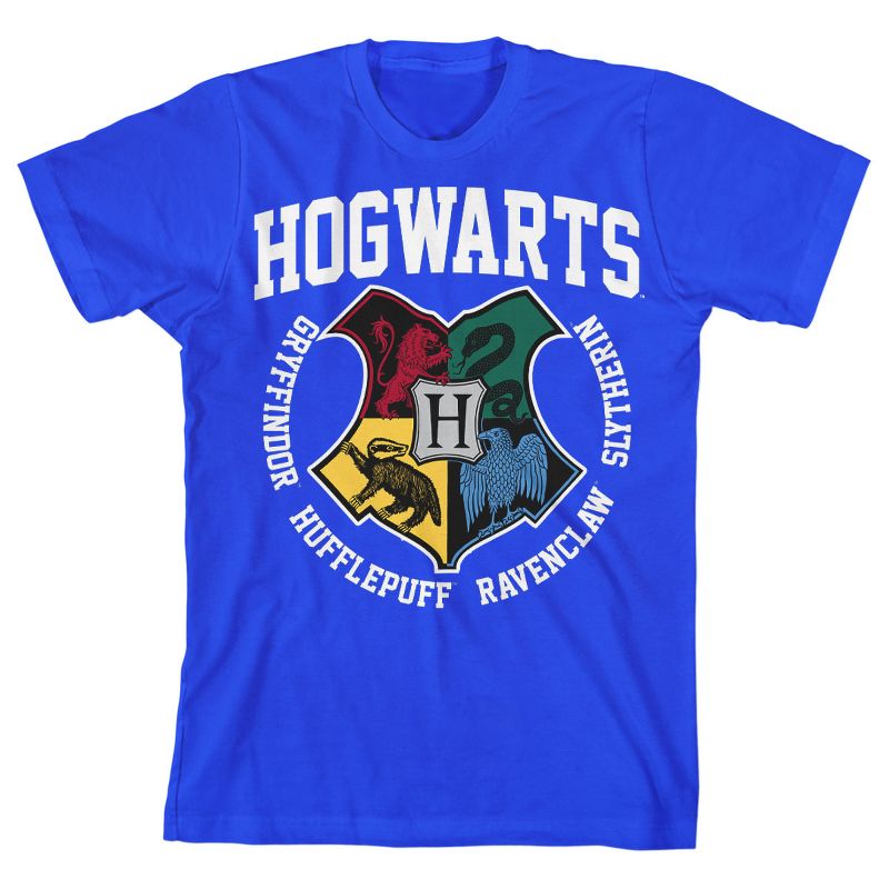 - تيشيرت برسومات جرافيكية: يزين هذا التيشيرت درع هوجورتس مع تمائم الحيوانات للمنازل الأربعة. تحيط أسماء جريفندور، وسليذرين، وهافلباف، ورافنكلو بالدرع بخط أبيض. سيحب عشاق هاري بوتر الصغار هذا التيشيرت.