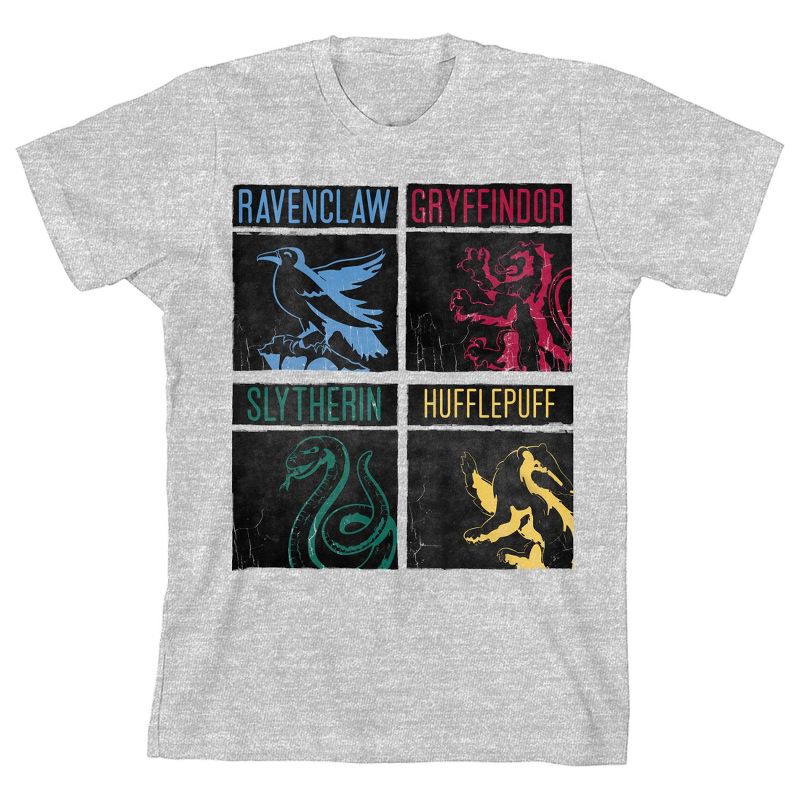 - تيشيرت برسومات جرافيكية: يُظهر هذا القميص تمائم مخلوقات منازل هوجورتس الأربعة. التمائم ملونة بالأزرق والأحمر والأخضر والأصفر لتتناسب مع منازلها، ومُصممة بتقنية ثلاثية الأبعاد. أسماء المنازل معروضة أعلاه بنفس الألوان.
