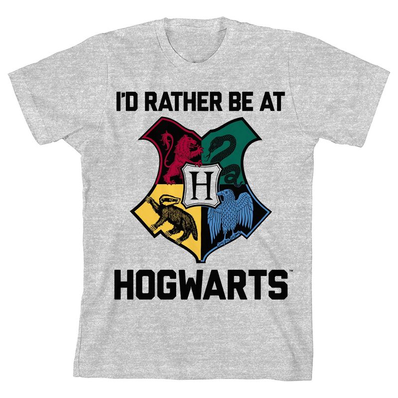 احتفل بعالم هاري بوتر السحري مع هذا التيشيرت للأولاد. يتميز القميص بدرع هوجورتس مع المنازل الأربعة. غريفين أحمر على خلفية سوداء، وثعبان أسود على خلفية خضراء، ونسر أزرق على خلفية سوداء، وغرير أسود على خلفية صفراء. كُتب على الشعار باللون الأسود "أفضّل أن أكون في هوجورتس". أظهر للعالم فخرك بمدرسة السحر مع هذا التيشيرت.
