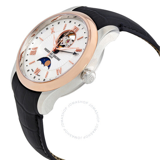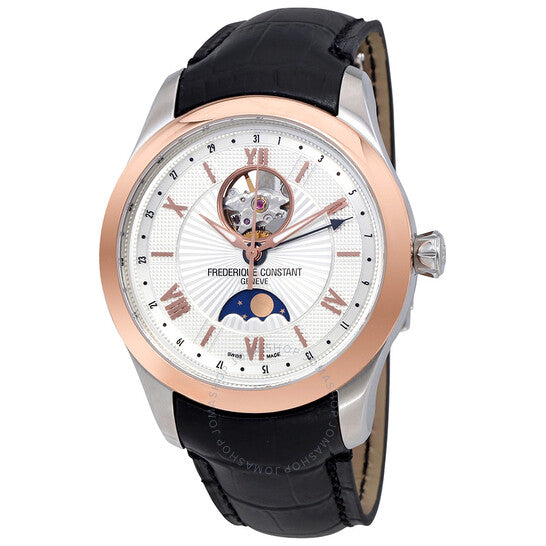 علبة من الفولاذ المقاوم للصدأ فضية اللون مع سوار جلدي أسود. إطار ثابت من الذهب الوردي عيار 18 قيراطًا. ميناء أبيض (بشاشة هيكلية) مع عقارب على شكل حرف ألفا بلون الذهب الوردي ومؤشرات ساعات بأرقام رومانية. مقياس تاريخ حول الحافة الخارجية (تاريخ المؤشر). نوع الميناء: تناظري. عقارب مضيئة. تاريخ المؤشر. ميناءان فرعيان يعرضان: طور القمر وقلب مفتوح. حركة أوتوماتيكية من عيار فريدريك كونستانت FC-335، مبنية على سيليتا SW200-1، تحتوي على 26 جوهرة، تنبض بمعدل 28800 ذبذبة في الساعة، ولديها احتياطي طاقة لمدة 38 ساعة تقريبًا. زجاج ياقوت مقاوم للخدش. تاج قابل للسحب/الدفع. غطاء خلفي شفاف. شكل دائري، حجم العلبة: 42 مم. مشبك قابل للطي. مقاومة للماء حتى عمق 50 مترًا / 165 قدمًا. الوظائف: التاريخ، الساعة، الدقيقة، الثانية، طور القمر. سلسلة ماكسيم هارت بيت. طراز ساعة رسمية. ملصق الساعة: صناعة سويسرية. ساعة فريدريك كونستانت هارت بيت أوتوماتيكية للرجال بمينا أبيض FC-335MS5MZ9-BK.