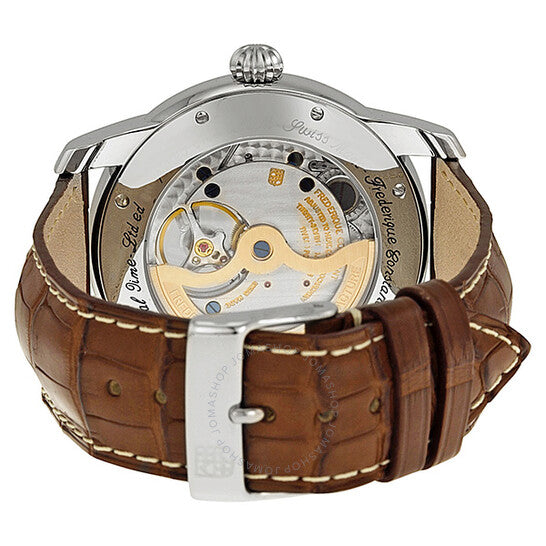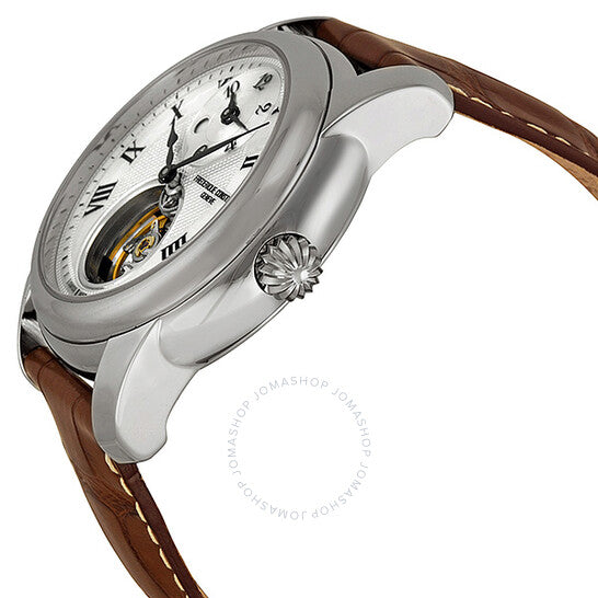 علبة فضية اللون من الفولاذ المقاوم للصدأ مع حزام جلدي بني. إطار ثابت من الفولاذ المقاوم للصدأ فضي اللون. ميناء فضي مزخرف بنقشة غيوشيه مع عقارب سوداء وعلامات ساعات رومانية. علامات دقائق حول الحافة الخارجية. نوع الميناء: تناظري. ميناءان فرعيان يعرضان: الساعة ١٢ عند موضع الساعة ١٢ ونبض القلب. حركة أوتوماتيكية من فريدريك كونستانت، عيار FC-938، تحتوي على ٢٦ جوهرة، مكونة من ١٢٧ جزءًا، تنبض بمعدل ٢٨٨٠٠ ذبذبة في الساعة، ولديها احتياطي طاقة لمدة ٤٢ ساعة تقريبًا. زجاج من الياقوت المقاوم للخدش. تاج لولبي. ظهر هيكلي. شكل دائري، حجم العلبة: ٤٢ مم. مشبك تانغ. مقاومة للماء حتى عمق ٥٠ مترًا / ١٦٥ قدمًا. الوظائف: توقيت غرينتش، المنطقة الزمنية الثانية، الساعات، الدقائق، مؤشر الليل/النهار. سلسلة هارت بيت مانيوفاكتشر. تصميم ساعة كاجوال. ملصق الساعة: صناعة سويسرية. ساعة فريدريك كونستانت هارت بيت للرجال ٩٣٨MC٤H٦.