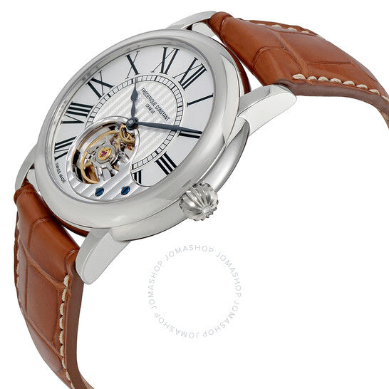 علبة فضية اللون من الفولاذ المقاوم للصدأ مع سوار جلدي بني. إطار ثابت من الفولاذ المقاوم للصدأ فضي اللون. ميناء فضي (هيكلي) بعقارب سوداء على شكل مجرفة وعلامات ساعات رومانية. علامات دقائق حول حلقة داخلية. نوع الميناء: تناظري. حركة أوتوماتيكية من عيار فريدريك كونستانت FC-930 مع احتياطي طاقة لمدة 42 ساعة. زجاج من الياقوت المقاوم للخدش. تاج قابل للسحب/الدفع. غطاء خلفي شفاف. شكل دائري، مقاس العلبة: 42 مم، سمكها: 10 مم. عرض السوار: 20 مم. مشبك تانغ. مقاومة للماء حتى عمق 50 مترًا / 165 قدمًا. الوظائف: الساعات، الدقائق. تصميم ساعة فاخرة. علامة الساعة: صناعة سويسرية. ساعة فريدريك كونستانت هيت بيت أوتوماتيكية للرجال 930MS4H6.