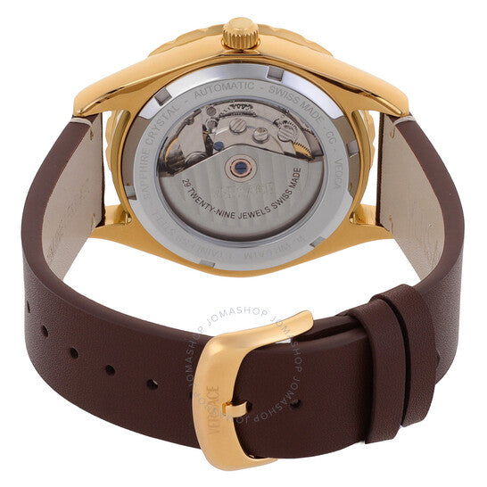 علبة من الفولاذ المقاوم للصدأ بلون ذهبي مع سوار جلدي بني. إطار ثابت من الفولاذ المقاوم للصدأ بلون أسود. ميناء أسود بعقارب وعلامات ساعات ذهبية اللون. علامات دقائق حول الحافة الخارجية. نوع الميناء: تناظري. عقارب وعلامات مضيئة. عرض التاريخ عند موضع الساعة 3. حركة أوتوماتيكية. تاج قابل للسحب/الدفع. شكل العلبة دائري، مقاسها: 42 مم، سمكها: 10 مم. عرض السوار: 20 مم. مشبك بإبزيم. مقاومة للماء حتى عمق 50 مترًا / 165 قدمًا. الوظائف: التاريخ، الساعة، الدقائق، الثواني. سلسلة هيلينيوم. تصميم كاجوال. علامة الساعة: صناعة سويسرية. ساعة فيرساتشي هيلينيوم أوتوماتيكية للرجال بمينا أسود VEQCA0224.