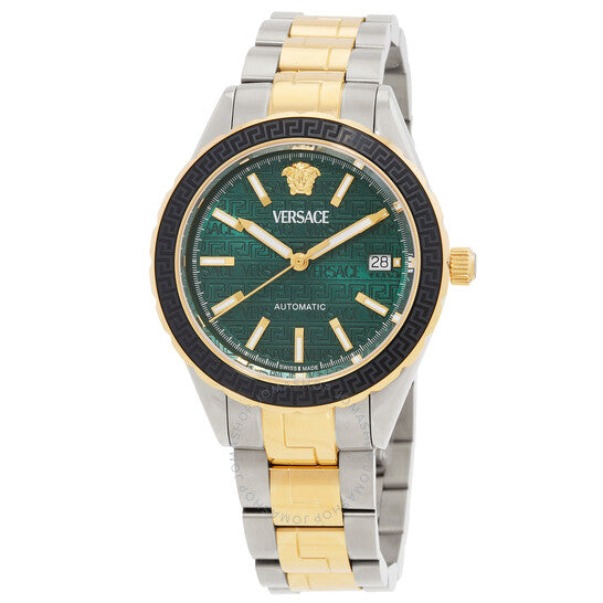 علبة فضية اللون من الفولاذ المقاوم للصدأ مع سوار ثنائي اللون (فضي وذهبي). إطار ثابت من الفولاذ المقاوم للصدأ أسود اللون. ميناء أخضر مع عقارب وعلامات ساعات ذهبية اللون. علامات دقائق حول الحافة الخارجية. نوع الميناء: تناظري. عقارب وعلامات مضيئة. عرض التاريخ عند موضع الساعة 3. حركة أوتوماتيكية. تاج قابل للسحب/الدفع. شكل العلبة دائري، مقاسها: 42 مم، سمكها: 10 مم. عرض السوار: 20 مم. مشبك قابل للطي بزر ضغط. مقاومة للماء حتى عمق 50 مترًا / 165 قدمًا. الوظائف: التاريخ، الساعة، الدقائق، الثواني. سلسلة هيلينيوم. تصميم كاجوال. علامة الساعة: صناعة سويسرية. ساعة فيرساتشي هيلينيوم أوتوماتيكية للرجال بمينا أخضر VEQCA0524.