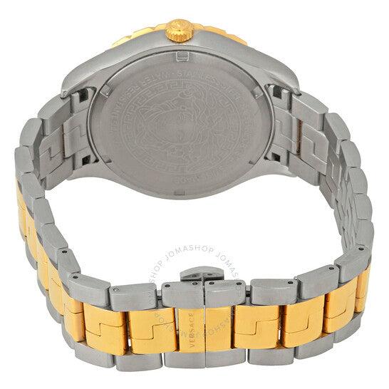 علبة من الفولاذ المقاوم للصدأ مع سوار من الفولاذ المقاوم للصدأ ثنائي اللون (فضي وذهبي أصفر مطلي بالأيون). إطار ثابت مطلي بالأيون من الذهب الأصفر يعرض علامات ٢٤ ساعة (بتوقيت غرينتش). ميناء بني مع عقارب مضيئة من الذهب الأصفر وعلامات ساعات بأرقام رومانية. يظهر شعار رأس ميدوسا عند موضع الساعة ١٢. علامات الدقائق حول الحافة الخارجية. نوع الميناء: تناظري. عقارب وعلامات مضيئة. عرض التاريخ عند موضع الساعة ٣. حركة كوارتز. كريستال ياقوتي مقاوم للخدش. غطاء خلفي صلب. حجم العلبة: ٤٢ مم. سمكها: ١٠ مم. شكلها دائري. عرض السوار: ٢٠ مم. مشبك قابل للطي بزر ضغط. مقاومة للماء حتى عمق ٥٠ مترًا / ١٦٥ قدمًا. الوظائف: التاريخ، الساعة، الدقيقة، الثانية. طراز ساعة رسمية. ملصق الساعة: صناعة سويسرية. ساعة فيرساتشي هيلينيوم للرجال بمينا بني ولونين V11040015.