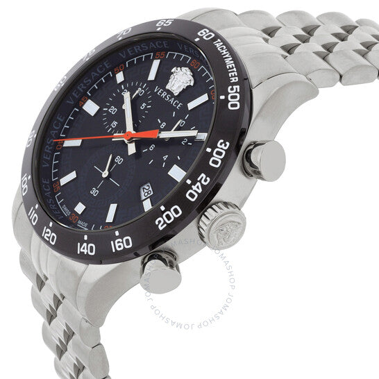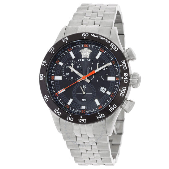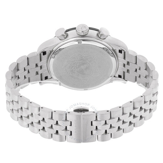 علبة وسوار من الفولاذ المقاوم للصدأ فضي اللون. إطار أسود من الفولاذ المقاوم للصدأ بمقياس سرعة دوران ثابت. ميناء أسود بعقارب وعلامات ساعات فضية اللون. رأس ميدوسا يُشير إلى موضع الساعة ١٢. علامات دقائق حول الحافة الخارجية. نوع الميناء: تناظري. عقارب وعلامات مضيئة. عرض التاريخ عند موضع الساعة ٤. كرونوغراف - ثلاثة أقراص فرعية تعرض: ٦٠ ثانية، ٣٠ دقيقة، وعُشر الثانية. آلية حركة كوارتز. زجاج ياقوت مقاوم للخدش. تاج قابل للسحب/الدفع. غطاء خلفي صلب. شكل دائري، حجم العلبة: ٤٤ مم. مشبك قابل للطي بزر ضغط. مقاومة للماء حتى عمق ٥٠ مترًا / ١٦٥ قدمًا. الوظائف: كرونوغراف، تاريخ، ساعة، دقيقة، ثانية. سلسلة هيلينيوم. طراز ساعة رياضية. علامة الساعة: صناعة سويسرية. ساعة فيرساتشي هيلينيوم كرونوغراف كوارتز سوداء للرجال VE2U00322.