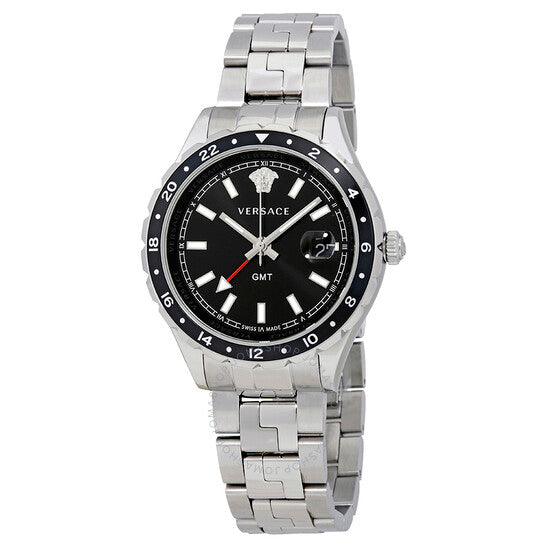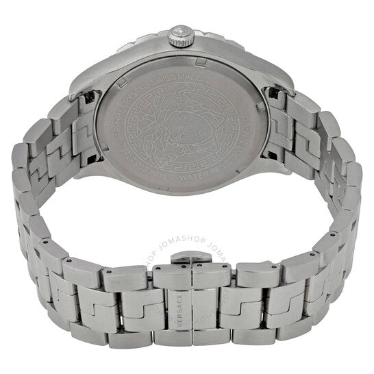 علبة من الفولاذ المقاوم للصدأ مع سوار من الفولاذ المقاوم للصدأ. إطار ثابت من الفولاذ المقاوم للصدأ مع حلقة علوية سوداء تعرض علامات ٢٤ ساعة (توقيت غرينتش). ميناء أسود بعقارب فضية مضيئة ومؤشرات ساعات رقمية رومانية. يظهر شعار رأس ميدوسا عند موضع الساعة ١٢. علامات دقائق حول الحافة الخارجية. نوع الميناء: تناظري. عقارب ومؤشرات مضيئة. عرض التاريخ عند موضع الساعة ٣. حركة كوارتز. كريستال ياقوتي مقاوم للخدش. غطاء خلفي صلب. حجم العلبة: ٤٢ مم. سمكها: ١٠.١٠ مم. شكلها دائري. عرض السوار: ٢٠ مم. مقاومة للماء حتى عمق ٥٠ مترًا / ١٦٥ قدمًا. الوظائف: توقيت غرينتش، منطقة زمنية ثانية، ساعة، دقيقة، ثانية، تاريخ. طراز ساعة رسمية. علامة الساعة: صناعة سويسرية. ساعة فيرساتشي هيلينيوم بتوقيت غرينتش للرجال V11100017 بمينا سوداء.