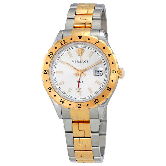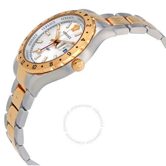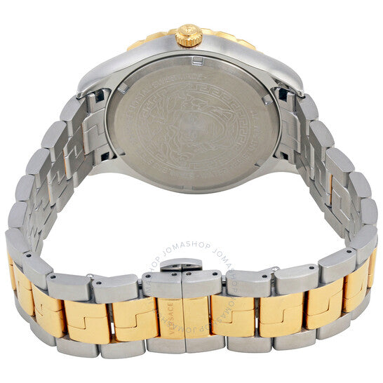 علبة فضية اللون من الفولاذ المقاوم للصدأ مع سوار ثنائي اللون (فضي وذهبي أصفر). إطار ثابت من الفولاذ المقاوم للصدأ بلون ذهبي أصفر. ميناء فضي مع عقارب وعلامات ساعات ذهبية اللون. علامات دقائق حول الحافة الخارجية. نوع الميناء: تناظري. عقارب وعلامات مضيئة. عرض التاريخ عند موضع الساعة 3. حركة كوارتز. زجاج ياقوتي مقاوم للخدش. غطاء خلفي صلب. حجم العلبة: 42 مم. سمكها: 10 مم. شكلها دائري. عرض السوار: 20 مم. مشبك قابل للطي بزر ضغط مزدوج. مقاومة للماء حتى عمق 50 مترًا / 165 قدمًا. الوظائف: توقيت غرينتش، المنطقة الزمنية الثانية، الساعات، الدقائق، الثواني، التاريخ. تصميم ساعة فاخرة. علامة الساعة: صناعة سويسرية. ساعة فيرساتشي هيلينيوم بتوقيت غرينتش للرجال، V1103 0015.