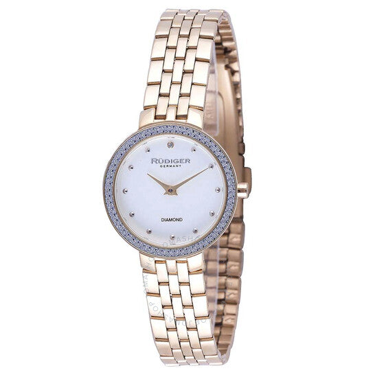علبة من الفولاذ المقاوم للصدأ بلون ذهبي مع سوار من الفولاذ المقاوم للصدأ بلون ذهبي. إطار ثابت من الفولاذ المقاوم للصدأ بلون ذهبي. ميناء أبيض بعقارب ذهبية اللون وعلامات ساعات. نوع الميناء: تناظري. حركة كوارتز. زجاج معدني مقاوم للخدش. تاج ضغط/سحب. غطاء خلفي صلب. شكل دائري، مقاس العلبة: ٢٦ مم، سمكها: ٦.٧٥ مم. عرض السوار: ١١.٦ مم، طوله: ٧.٥ بوصة. مشبك قابل للطي. مقاومة للماء حتى عمق ٥٠ مترًا / ١٦٥ قدمًا. الوظائف: الساعات، الدقائق. تصميم كاجوال. ساعة روديجر هيسه النسائية بمينا أبيض R3300-09-001.