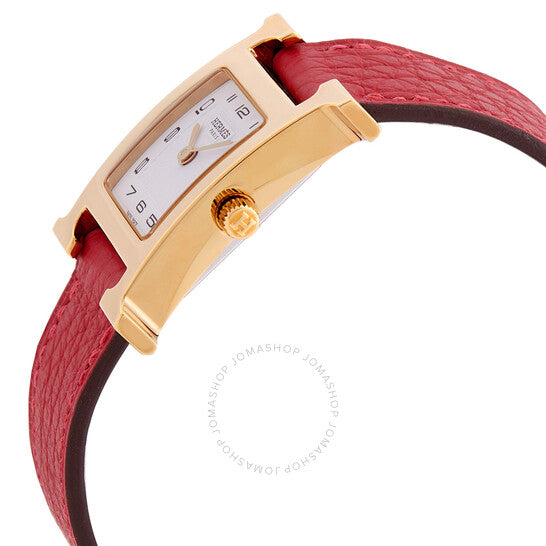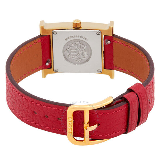 علبة من الفولاذ المقاوم للصدأ بلون ذهبي مع سوار جلدي أحمر. إطار ثابت من الفولاذ المقاوم للصدأ بلون ذهبي. ميناء أبيض بعقارب ذهبية اللون وعلامات ساعات بأرقام عربية. نوع الميناء: تناظري. حركة كوارتز. زجاج من الياقوت المقاوم للخدش. تاج قابل للسحب/الدفع. غطاء خلفي صلب. شكل العلبة مربع، مقاسها: ٢١ مم. مشبك بإبزيم. مقاومة للماء حتى عمق ٣٠ مترًا / ١٠٠ قدم. الوظائف: الساعات، الدقائق. سلسلة Heure H. ساعة كاجوال. علامة الساعة: صناعة سويسرية. ساعة هيرمس Heure H كوارتز نسائية بمينا بيضاء، 040887WW00.