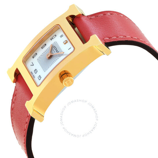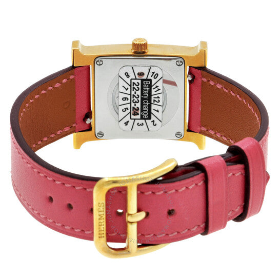 علبة من الفولاذ المقاوم للصدأ بلون ذهبي مع سوار جلدي. إطار ثابت من الفولاذ المقاوم للصدأ بلون ذهبي. ميناء أبيض بأرقام عربية. نوع الميناء: تناظري. حركة كوارتز. زجاج ياقوت مقاوم للخدش. تاج قابل للسحب/الدفع. غطاء خلفي صلب. شكل العلبة مربع، مقاسها: ٢١ مم. مشبك بإبزيم. مقاومة للماء حتى عمق ٣٠ مترًا / ١٠٠ قدم. الوظائف: الساعات، الدقائق. سلسلة Heure H. ساعة كاجوال. علامة الساعة: صناعة سويسرية. ساعة هيرمس Heure H كوارتز نسائية بمينا بيضاء، 049714WW00.