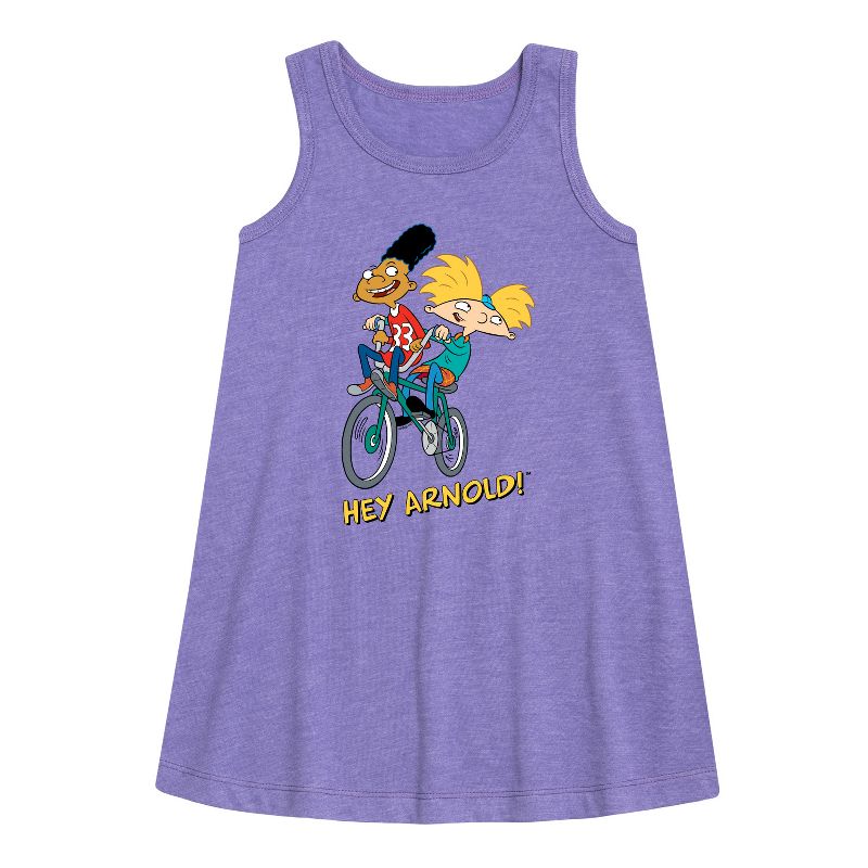 هيا أرنولد! - دراجة أرنولد وجيرولد - فستان بقصة حرف A للفتيات الصغيرات والشابات - تألقي بأناقتكِ مع ملابس هيا أرنولد! الجرافيكية. تتميز هذه التصاميم بأرنولد وهيلجا ورفاقهما، وتعكس روح وروح هذا المسلسل الكرتوني المحبوب الذي يتناول قصة النشأة في المدينة الكبيرة.