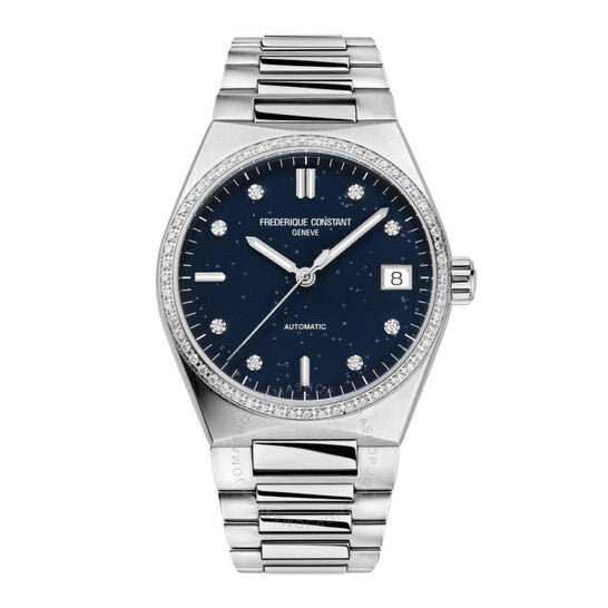 علبة وسوار من الفولاذ المقاوم للصدأ فضي اللون. إطار ثابت فضي اللون مرصع بالألماس من الفولاذ المقاوم للصدأ. ميناء أزرق بعقارب فضية اللون وعلامات ساعات من الألماس. علامات دقائق حول الحافة الخارجية. نوع الميناء: تناظري. عقارب وعلامات مضيئة. عرض التاريخ عند موضع الساعة 3. حركة أوتوماتيكية من فريدريك كونستانت، كاليبر FC-303، مبنية على سيليتا SW200-1، تحتوي على 26 جوهرة، تنبض بمعدل 28800 ذبذبة في الساعة، ولديها احتياطي طاقة يدوم حوالي 38 ساعة. زجاج ياقوت مقاوم للخدش. غطاء خلفي شفاف. شكل العلبة دائري، حجمها 34 مم. مقاومة للماء حتى عمق 50 مترًا / 165 قدمًا. الوظائف: التاريخ، الساعة، الدقيقة، الثانية. سلسلة هاي لايف. طراز ساعة رسمية. علامة الساعة: صناعة سويسرية. ساعة فريدريك كونستانت هاي لايف أوتوماتيكية نسائية بمينا زرقاء مرصعة بالألماس، FC-303NSD2NHD6B.