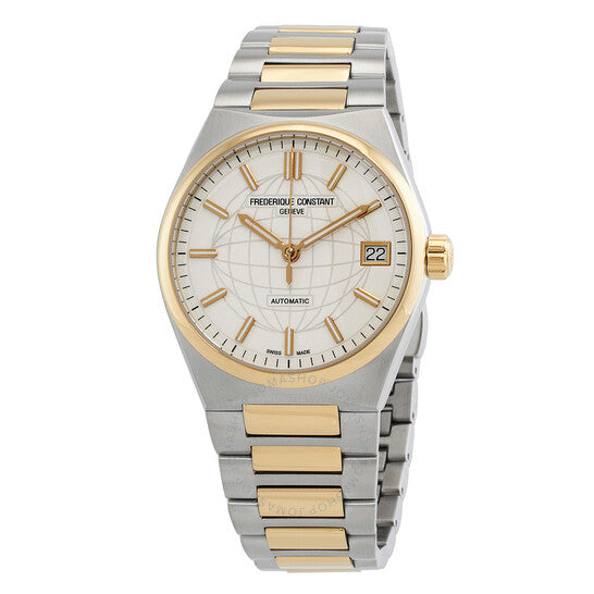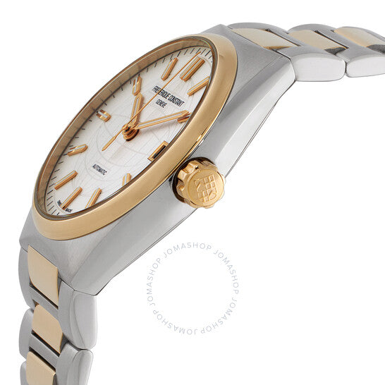 علبة فضية اللون من الفولاذ المقاوم للصدأ مع سوار ثنائي اللون (فضي وذهبي). إطار ثابت من الفولاذ المقاوم للصدأ بلون ذهبي أصفر. ميناء فضي أبيض مع عقارب وعلامات ساعات ذهبية اللون. علامات دقائق حول الحافة الخارجية. نوع الميناء: تناظري. عقارب وعلامات مضيئة. عرض التاريخ عند موضع الساعة 3. حركة أوتوماتيكية من عيار فريدريك كونستانت FC-303، مبنية على سيليتا SW200-1، تحتوي على 26 جوهرة، تنبض بمعدل 28800 ذبذبة في الساعة، ولديها احتياطي طاقة لمدة 38 ساعة تقريبًا. زجاج ياقوت مقاوم للخدش. تاج لولبي. غطاء خلفي شفاف. شكل العلبة دائري، مقاسها 34 مم. مشبك قابل للطي مع مفتاح أمان. مقاومة للماء حتى عمق 50 مترًا / 165 قدمًا. الوظائف: التاريخ، الساعة، الدقيقة، الثانية. سلسلة هاي لايف. طراز ساعة رسمية. علامة الساعة: صناعة سويسرية. ساعة فريدريك كونستانت هاي لايف أوتوماتيكية للسيدات FC-303V2NH3B.