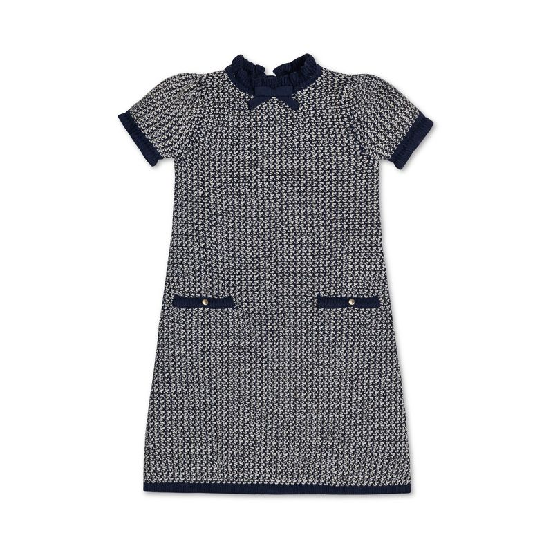 ستتألق فتاتك بأناقة باريسية مع فستاننا الصوفي قصير الأكمام المصنوع من القطن العضوي الناعم. يتميز بتطريز كشكش على الياقة والأكمام، وحواف متباينة مع فيونكة أنيقة، وأزرار ذهبية على شكل ساق من الخلف لسهولة الارتداء. غرزة سميكة تشبه التويد تُضفي لمسة راقية على هذه القطعة.