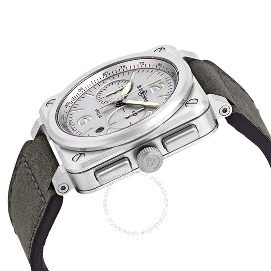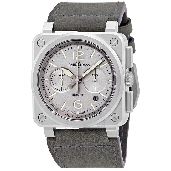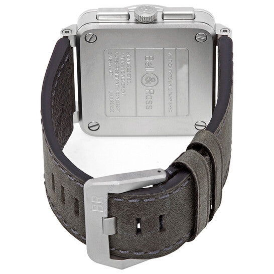 علبة فولاذية مصقولة بتقنية التفجير الدقيق مع سوار جلدي رمادي أخضر (جلد العجل). إطار فولاذي ثابت مصقول بتقنية التفجير الدقيق. ميناء رمادي مع عقارب ومؤشرات ساعات فضية مضيئة. أرقام عربية تُشير إلى موضعي الساعة 6 و12. علامات الدقائق. علامات تاكيميتر حول الحافة الخارجية. نوع الميناء: تناظري. عقارب ومؤشرات مضيئة. عرض التاريخ بين موضعي الساعة 4 و5. كرونوغراف - ميناءان فرعيان يعرضان: 60 ثانية و30 دقيقة. حركة أوتوماتيكية من بيل آند روس، عيار BR-CAL.301، مبنية على ETA 2894-2، تحتوي على 37 جوهرة، تنبض بمعدل 28800 ذبذبة في الساعة، ولديها احتياطي طاقة لمدة 42 ساعة تقريبًا. زجاج ياقوت مقاوم للخدش. تاج قابل للسحب/الدفع. غطاء خلفي صلب. شكل العلبة مربع. حجم العلبة: 42 مم. سمك العلبة: 12.6 مم. مشبك تانغ. مقاومة للماء حتى عمق ١٠٠ متر / ٣٣٠ قدمًا. الوظائف: كرونوغراف، مقياس سرعة الدوران، التاريخ، الساعات، الدقائق، الثواني. سلسلة هورلوم. تصميم فاخر. علامة الساعة: صناعة سويسرية. ساعة بيل آند روس هورولوم الأوتوماتيكية كرونوغراف للرجال BR0394-GR-ST/SCA.