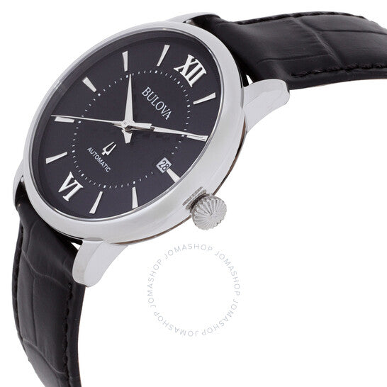 علبة من الفولاذ المقاوم للصدأ فضية اللون مع سوار جلدي أسود. إطار ثابت من الفولاذ المقاوم للصدأ فضي اللون. ميناء أسود بعقارب فضية اللون ومؤشرات ساعات بأرقام رومانية. نوع الميناء: تناظري. عرض التاريخ عند موضع الساعة 3. حركة أوتوماتيكية من بولوفا كاليبر 8215. زجاج ياقوتي مقاوم للخدش. غطاء خلفي شفاف. شكل العلبة دائري، مقاسها: 39 مم. عرض السوار: 20 مم. مشبك تانغ. مقاومة للماء حتى عمق 30 مترًا / 100 قدم. سلسلة هدسون. طراز الساعة الرياضية. علامة الساعة: صناعة سويسرية. ساعة بولوفا هدسون أوتوماتيكية للرجال بمينا أسود، 96B441.