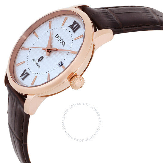 علبة من الفولاذ المقاوم للصدأ بلون الذهب الوردي مع سوار جلدي بني. إطار ثابت من الفولاذ المقاوم للصدأ بلون الذهب الوردي. ميناء فضي اللون مع عقارب بلون الذهب الوردي ومؤشرات ساعات بأرقام رومانية. نوع الميناء: تناظري. عرض التاريخ عند موضع الساعة 3. آلية حركة كوارتز. زجاج ياقوتي مقاوم للخدش. تاج قابل للسحب والدفع. غطاء خلفي شفاف. شكل العلبة دائري، مقاسها: 39 مم. عرض السوار: 20 مم. مشبك إبزيم سلكي من 3 قطع. مقاومة للماء حتى عمق 30 مترًا / 100 قدم. الوظائف: التاريخ، الساعة، الدقيقة، الثانية. سلسلة هدسون. طراز ساعة رسمية. علامة الساعة: Japan Movt. ساعة بولوفا هدسون كوارتز رجالية بمينا فضية اللون، 97B225.