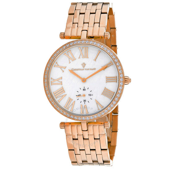 علبة وسوار من الفولاذ المقاوم للصدأ بلون الذهب الوردي. إطار ثابت من الفولاذ المقاوم للصدأ بلون الذهب الوردي. ميناء من عرق اللؤلؤ مع عقارب بلون الذهب الوردي وعلامات ساعات بأرقام رومانية. نوع الميناء: تناظري. حركة كوارتز. زجاج معدني مقاوم للخدش. شكل العلبة دائري، مقاسها: 36 مم، سمكها: 8 مم. عرض السوار: 18 مم، طوله: 7.5 بوصة. مشبك قابل للطي مع قفل أمان. مقاومة للماء حتى عمق 3 أمتار / 10 أقدام. وظائفها: الساعات، الدقائق، الثواني. سلسلة هاش. ساعة أنيقة. ساعة كريستيان فان سانت هاش كوارتز نسائية CV0293.