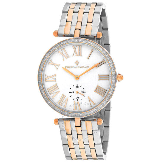 علبة من الفولاذ المقاوم للصدأ فضية اللون مع سوار من الفولاذ المقاوم للصدأ ثنائي اللون (فضي وذهبي وردي). إطار ثابت من الفولاذ المقاوم للصدأ فضي اللون. ميناء من عرق اللؤلؤ مع عقارب ذهبية وردية وعلامات ساعات بأرقام رومانية. نوع الميناء: تناظري. حركة كوارتز. زجاج معدني مقاوم للخدش. شكل العلبة دائري، مقاسها: 36 مم، سمكها: 8 مم. عرض السوار: 18 مم، طوله: 7.5 بوصة. مشبك قابل للطي مع مفتاح أمان. مقاومة للماء حتى عمق 3 أمتار / 10 أقدام. الوظائف: الساعات، الدقائق، الثواني. سلسلة هاش. ساعة أنيقة. ساعة كريستيان فان سانت هاش كوارتز نسائية CV0297.
