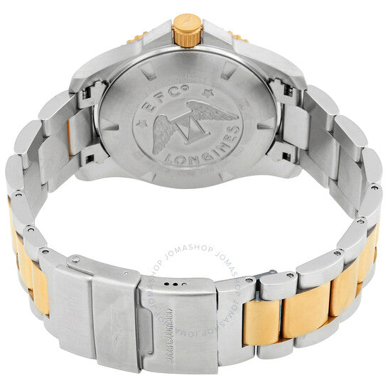 علبة من الفولاذ المقاوم للصدأ مع سوار من الفولاذ المقاوم للصدأ ثنائي اللون (فضي وذهبي أصفر مطلي بتقنية PVD). إطار دوار أحادي الاتجاه من الذهب الأصفر مطلي بتقنية PVD مع حلقة سيراميك زرقاء مرصعة. ميناء أزرق مع عقارب مضيئة من الذهب الأصفر وعلامات ساعات منقطة. تظهر الأرقام العربية عند الساعة 6 و9 و12. علامات الدقائق حول الحافة الخارجية. نوع الميناء: تناظري. عقارب وعلامات مضيئة. عرض التاريخ عند الساعة 3. حركة لونجين الأوتوماتيكية عيار L888، مبنية على ETA A31.L11، تحتوي على 21 جوهرة، تنبض بمعدل 25200 ذبذبة في الساعة، ولديها احتياطي طاقة لمدة 64 ساعة تقريبًا. زجاج من الياقوت المقاوم للخدش. تاج لولبي. غطاء خلفي صلب. شكل دائري. حجم العلبة: 41 مم. سمك العلبة: 11.9 مم. عرض السوار: 21 مم. مشبك قابل للطي. مقاومة للماء حتى عمق ٣٠٠ متر / ١٠٠٠ قدم. الوظائف: التاريخ، الساعة، الدقيقة، الثانية. معلومات إضافية: العلبة الأصلية، دليل الاستخدام (ملحقات كاملة). سلسلة هايدروكونكويست. تصميم ساعة فاخر. علامة الساعة: صناعة سويسرية. ساعة لونجين هايدروكونكويست أوتوماتيكية للرجال بمينا أزرق L3.781.3.96.7.