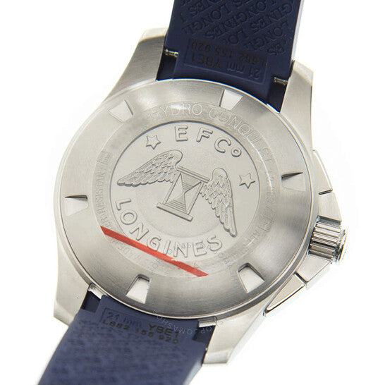 علبة من الفولاذ المقاوم للصدأ مع سوار مطاطي أزرق. إطار دوار أحادي الاتجاه من الفولاذ المقاوم للصدأ مع حلقة سيراميك زرقاء. ميناء أزرق بعقارب فضية مضيئة وعلامات ساعات منقطة. يظهر رقم عربي عند موضع الساعة ١٢. علامات دقائق حول الحافة الخارجية. نوع الميناء: تناظري. عقارب وعلامات مضيئة. عرض التاريخ عند موضع الساعة ٤. كرونوغراف - ثلاثة أقراص فرعية تعرض: ٦٠ ثانية، ٣٠ دقيقة، و١٢ ساعة. حركة لونجين أوتوماتيكية عيار L688، مبنية على ETA A08.L01، تحتوي على ٢٧ جوهرة، تنبض بتردد ٢٨٨٠٠ ذبذبة في الساعة، ولديها احتياطي طاقة لمدة ٥٤ ساعة تقريبًا. زجاج ياقوت مقاوم للخدش. تاج لولبي. غطاء خلفي صلب. شكل دائري. حجم الهيكل: ٤٣ مم. عرض السوار: ٢٢ مم. مشبك قابل للطي. مقاومة للماء حتى عمق ٣٠٠ متر / ١٠٠٠ قدم. الوظائف: كرونوغراف، عجلة عمودية، تاريخ، ساعات، دقائق، ثوانٍ صغيرة. سلسلة هيدروكونكويست. طراز ساعة غوص. علامة الساعة: صناعة سويسرية. ساعة لونجين هيدروكونكويست كرونوغراف أوتوماتيكية بمينا زرقاء للرجال، طراز L38834969.
